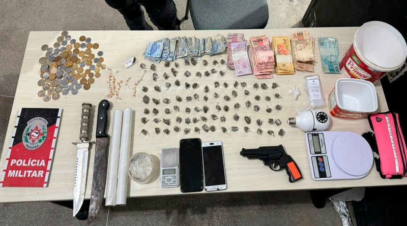 Ao todo, foram apreendidos aproximadamente R$ 1.920,00 reais em espécie, 42 pedras de crack, 02 porções de cocaína, 87 trouxinhas de maconha, 03 celulares, 02 facas, duas balanças de precisão, 01 câmera de monitoramento, 01 simulacro de revólver e diversos materiais utilizados para preparo e acondicionamento de entorpecentes.